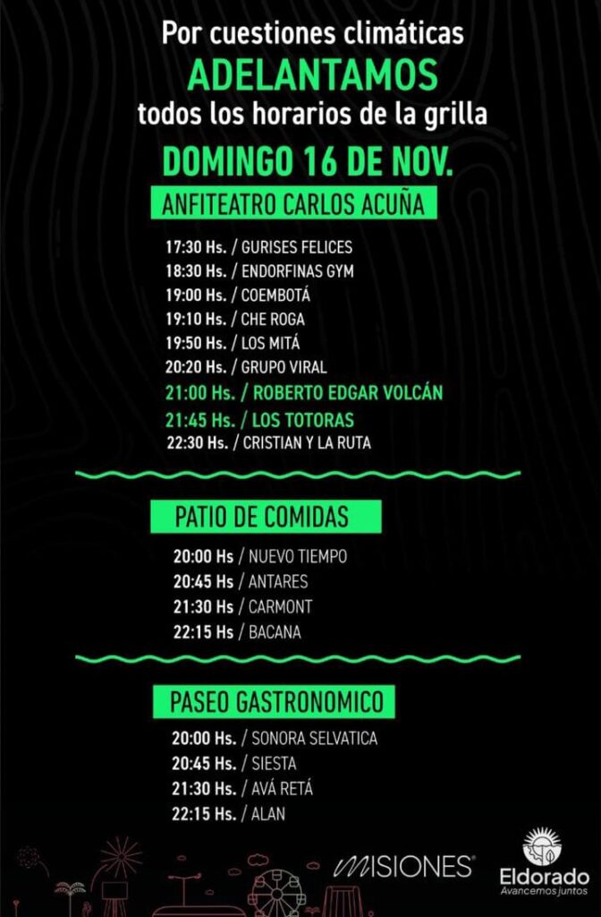Debido a las inclemencias del tiempo, la organización reprogramó el cierre de la Expo Eldorado 2025 para mañana. La grilla de actividades y horarios sigue siendo la misma.